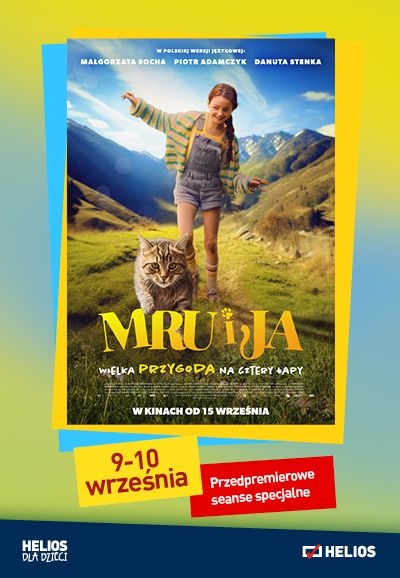 Kolejna propozycja to przedpremierowe projekcje filmu „Mru i ja: wielka przygoda na cztery łapy”, które odbędą się 9 i 10 września w ramach projektu Helios dla Dzieci. Cleo i Mru mają spędzić leniwe wakacje, ale zawadiacki kot wyrusza w podróż, aby odnaleźć swoją dziką naturę. Pokazom towarzyszyć będą konkursy i zabawy.