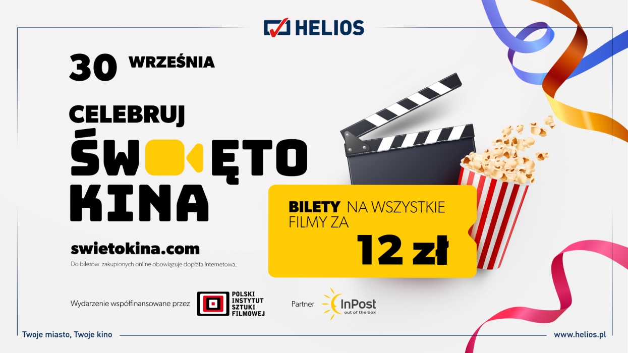 Kina, odbywające się w sobotę 30 września, dzięki któremu bilety będą dostępne w cenie tylko 12 złotych. W tym tygodniu w kinach Helios zagoszczą: thriller „Doppelgänger. Sobowtór”, horror „Piła X” i film sci-fi „Twórca”. Na widzów tradycyjnie czekają także światowe hity, rodzime przeboje, emocjonujące seanse przedpremierowe i projekty specjalne. Zapraszamy