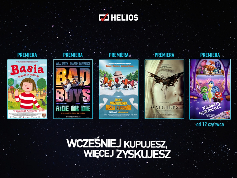 Czerwiec będzie czasem porywających nowości dla kinomanów o różnorodnych gustach. W najbliższym tygodniu w repertuarze Heliosa pojawi się aż pięć emocjonujących premier: „Bad Boys: Ride or Die”, „The Watchers”, „Basia. Jestem w sam raz”, „Jurek Maskonurek” oraz „W głowie się nie mieści 2”. Sieć kin przygotowała również wyjątkowe seanse pierwszego odcinka nowego sezonu serialu HBO Original „Ród smoka”, na które rejestrować można się już teraz! W cyklu Kultura Dostępna zaprezentowany zostanie polski kandydat do Oscara – „Chłopi”. Zapraszamy
