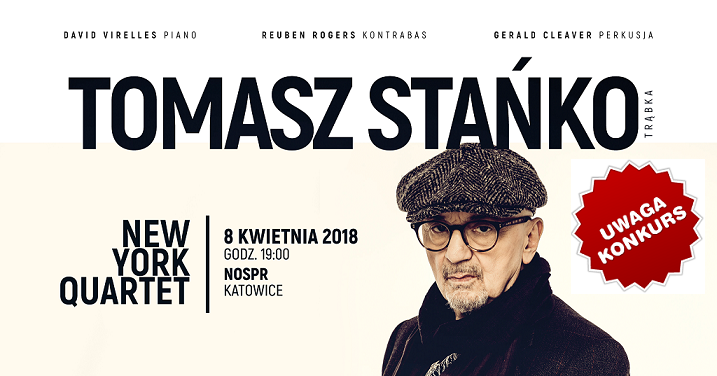 Mamy dla was do wygrania podwójne zaproszenie na koncert TOMASZ STAŃKO NEW YORK QUARTET który odbędzie się 8 kwietnia o godz. 19:00 w Sali Koncertowej "NOSPR" w Katowicach.