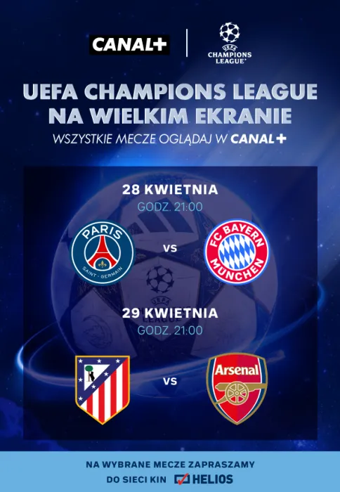 W wybranych kinach fanów sportowych emocji czekają transmisje półfinałów Ligi Mistrzów UEFA – to wyjątkowa okazja, by przeżywać piłkarskie widowiska na wielkim ekranie. We wtorek, 28 kwietnia PSG podejmie u siebie świeżo upieczonego mistrza Niemiec – Bayern Monachium. Następnie w środowy wieczór, 29 kwietnia Atletico Madryt stoczy pasjonujący pojedynek z Arsenalem Londyn – tych spotkań nie może przegapić żaden kibic!