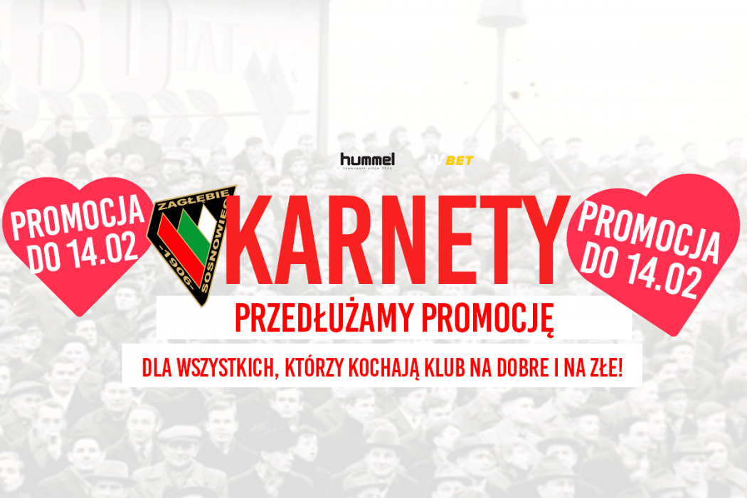 Zagłębie Sosnowiec, za pośrednictwem swojej oficjalnej strony, poinformowało o przedłużeniu Promocyjnej sprzedaży Karnetów Extra, która została przedłużona do 14 lutego. Zapraszamy do kupna w atrakcyjnej cenie.