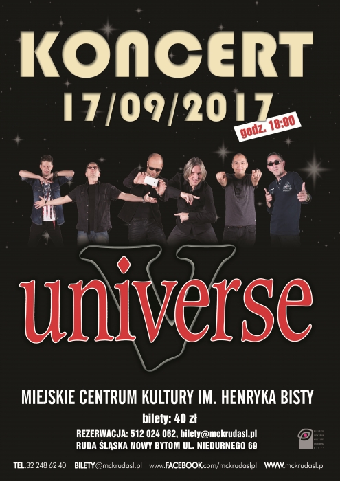 Legenda polskiej muzyki pop, od 35 lat nieprzerwanie obecny na rodzimych estradach. Universe tworzy aktualnie sześciu muzyków. Wielkim atutem grupy jest świetne brzmienie, wypracowane przez lata wspólnego grania, oraz wspaniałe przeboje.