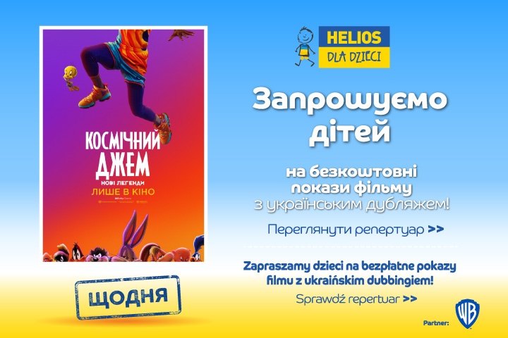 Sieć kin Helios zaprasza dzieci na specjalne seanse filmu „Kosmiczny Mecz: Nowa Era” z ukraińskim dubbingiem od piątku, 4 marca. Szczegóły dotyczące pokazów dostępne są pod adresem: www.helios.pl/dzieci_ua.